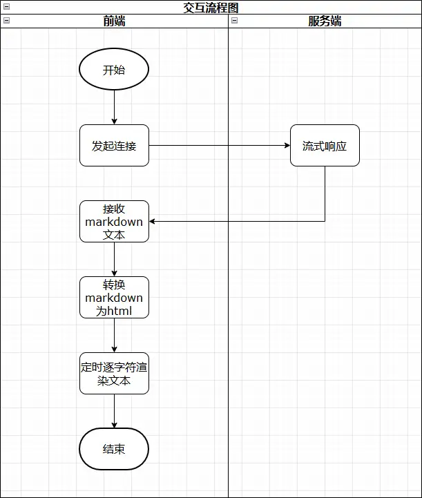 最开始的产品功能,需要根据用户输入的搜索词,流式输出并逐字符展示到页面上,这可以说是打字机效果的入门级实现了,不依赖任何复杂的技术,其流程图大致如下所示。