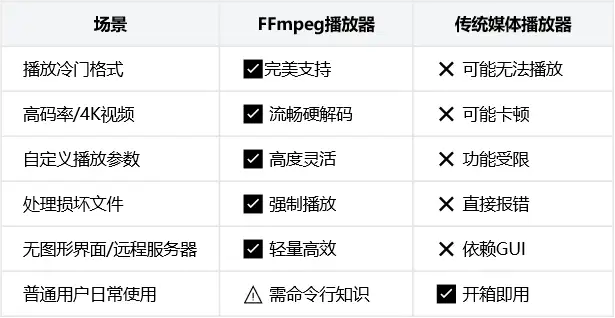 FFmpeg 无图形界面(如 ffplay),资源消耗更少,适合老旧设备或后台处理。